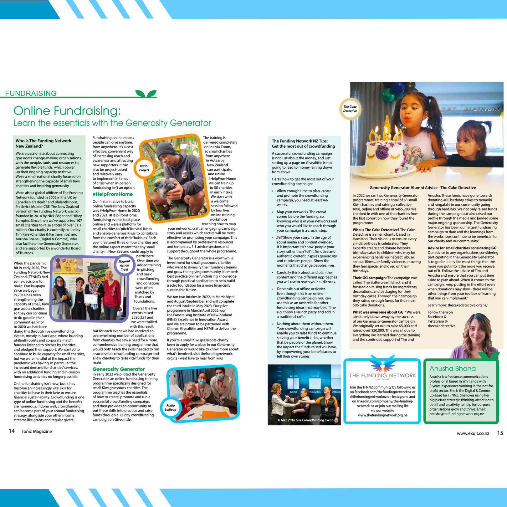 Exult provided in-kind prizes for our third Generosity Generator in 2023. The team also invited Tim & Anusha to deliver a crowdfunding workshop at the 2023 Tonic Conference, and published an article about Generosity Generator in the May 2023 issue of Tonic Magazine.